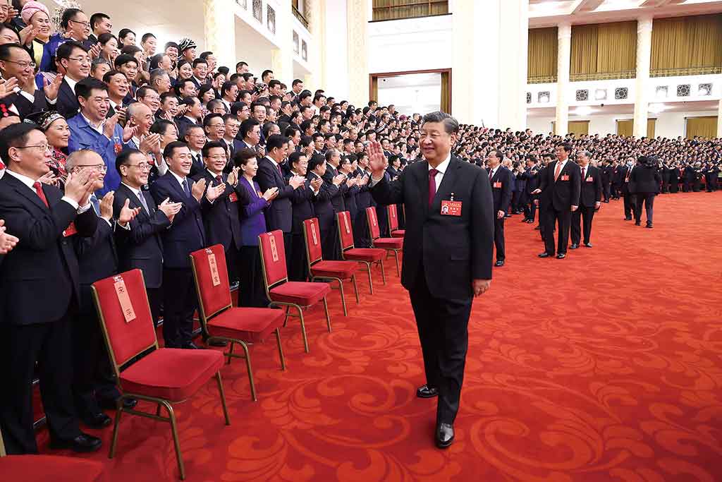 10月23日下午,中共中央總書記、國家主席、中央軍委主席習近平等領導同志在北京人民大會堂親切會見出席黨的二十大代表、特邀代表和列席人員,并同大家合影留念。新華社記者 鞠 鵬 攝