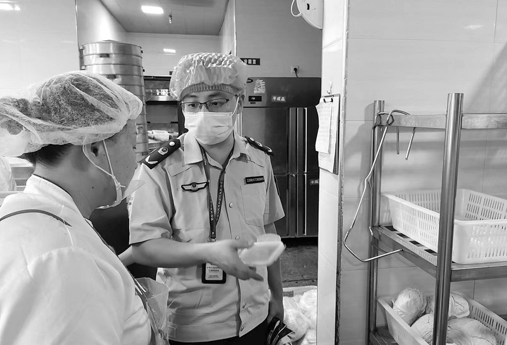 圖為日前執(zhí)法人員在一所學校食堂,督促工作人員做好食材管理。