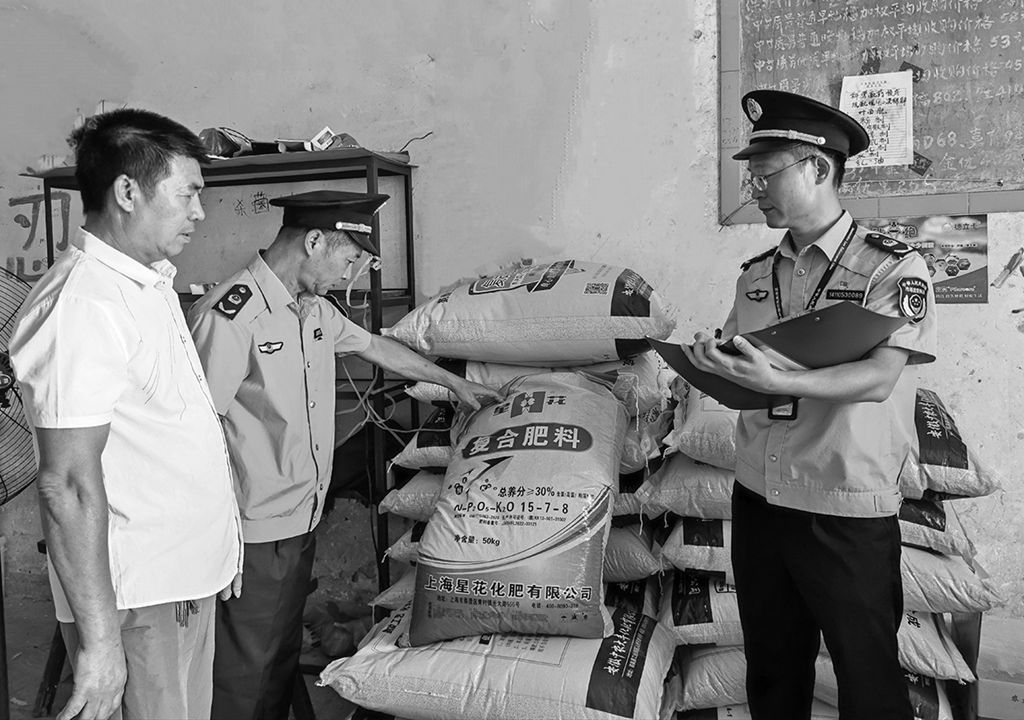 圖為執(zhí)法人員在一家農(nóng)資經(jīng)營門市部檢查化肥標簽標識。
