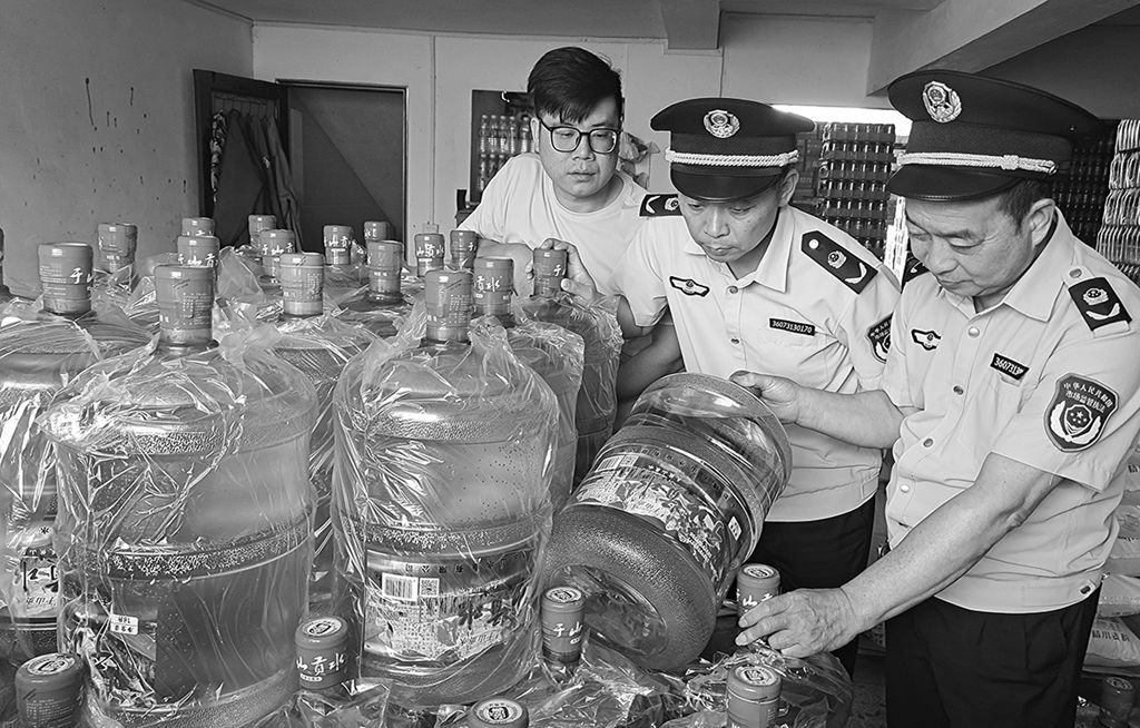 圖為7月10日?qǐng)?zhí)法人員對(duì)桶裝飲用水進(jìn)行檢查。