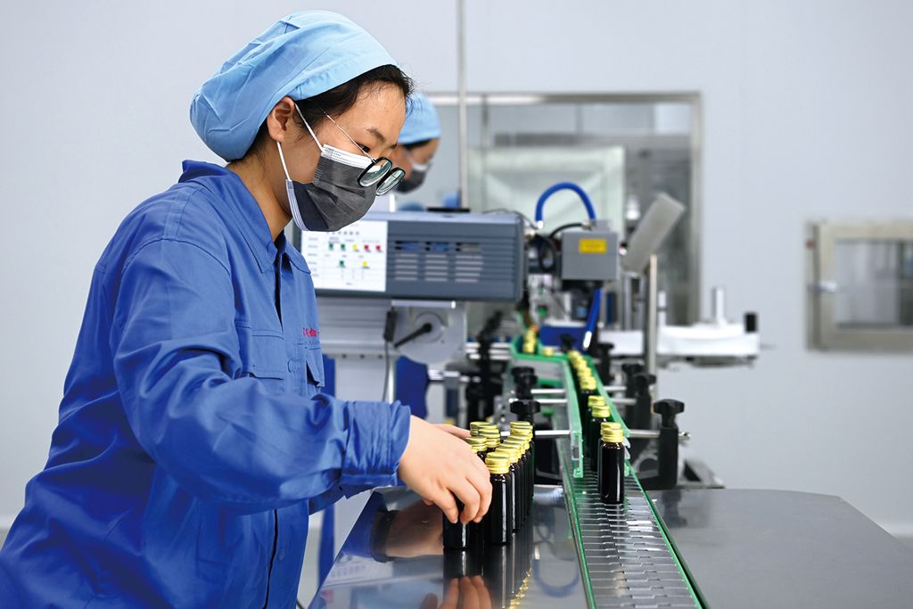 一家中藥科技企業(yè)的工人在藥品灌裝生產(chǎn)線上作業(yè)。
