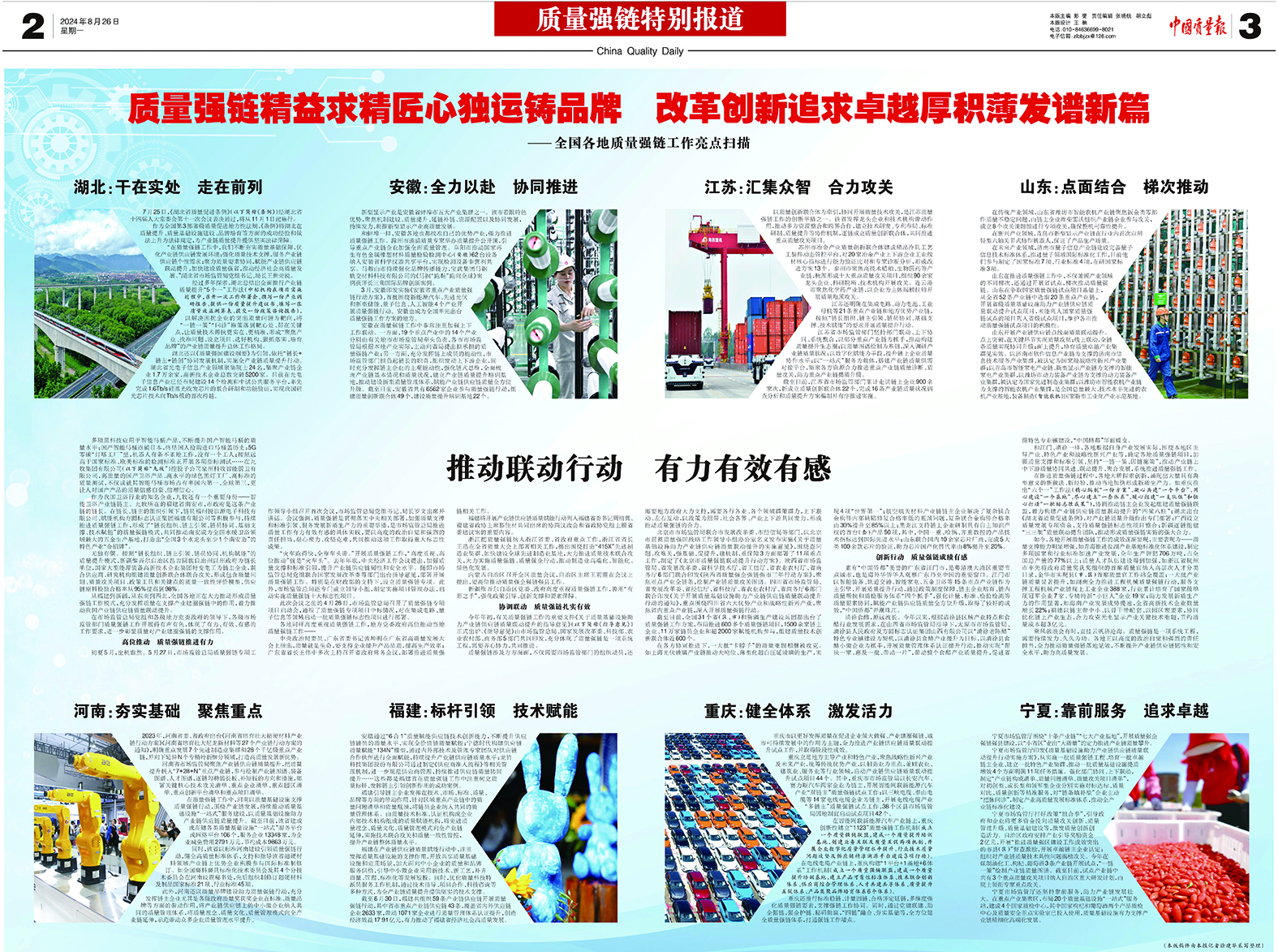 本報(bào)今日第二版至第四版推出“質(zhì)量強(qiáng)鏈特別報(bào)道”,展現(xiàn)全國市場(chǎng)監(jiān)管系統(tǒng)推動(dòng)產(chǎn)業(yè)鏈供應(yīng)鏈點(diǎn)線面質(zhì)量聯(lián)動(dòng)提升的生動(dòng)實(shí)踐。