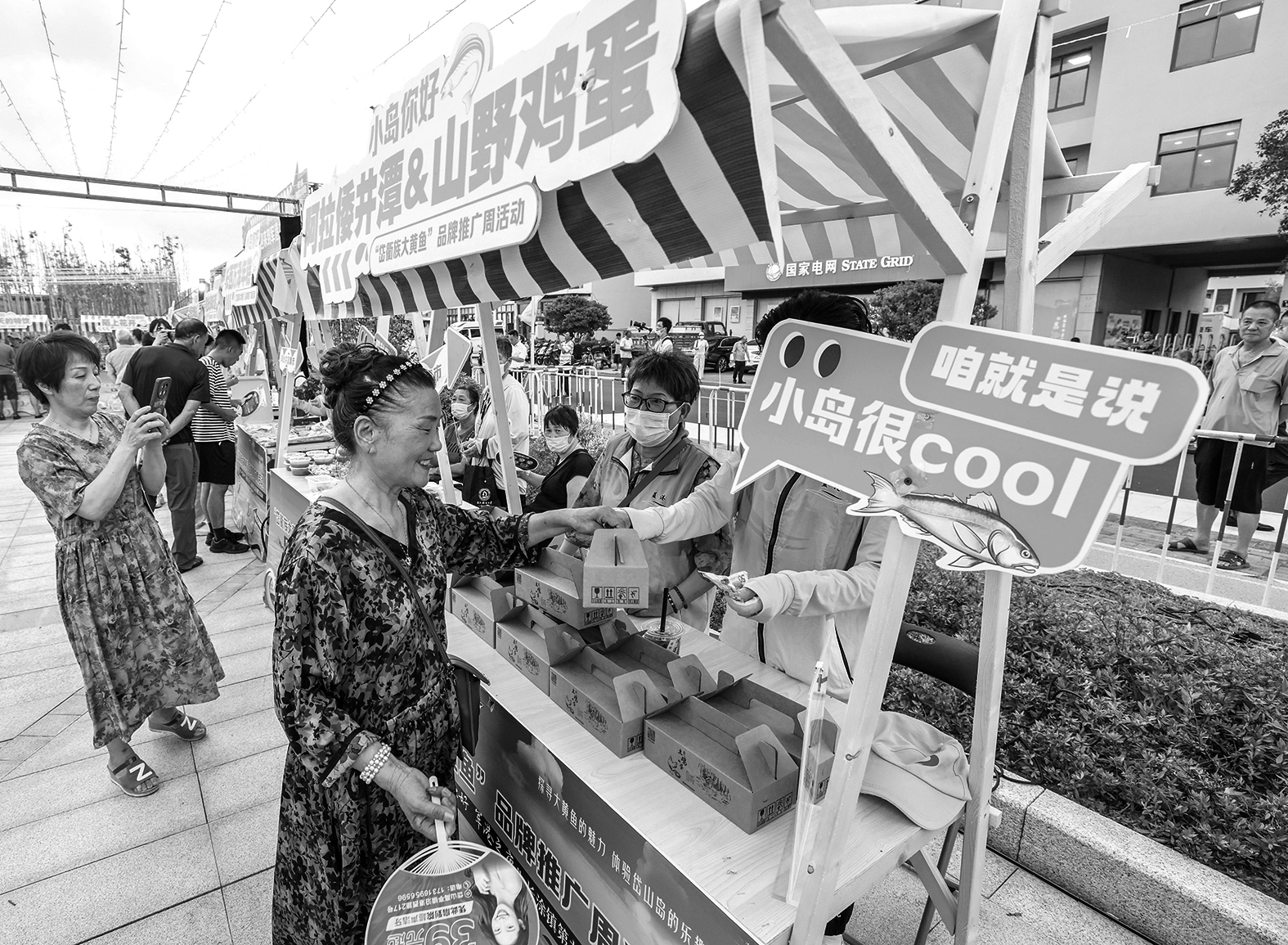 近年來(lái),浙江省舟山市長(zhǎng)涂鎮(zhèn)推進(jìn)大黃魚深水養(yǎng)殖基地建設(shè),在大黃魚的品相、美味度等方面實(shí)現(xiàn)長(zhǎng)足提升,并通過(guò)開辦黃魚宴等活動(dòng)吸引游客,推廣黃魚品牌,促進(jìn)海島農(nóng)文旅產(chǎn)業(yè)融合發(fā)展。圖為近日,游客在當(dāng)?shù)丶匈?gòu)買特色商品。