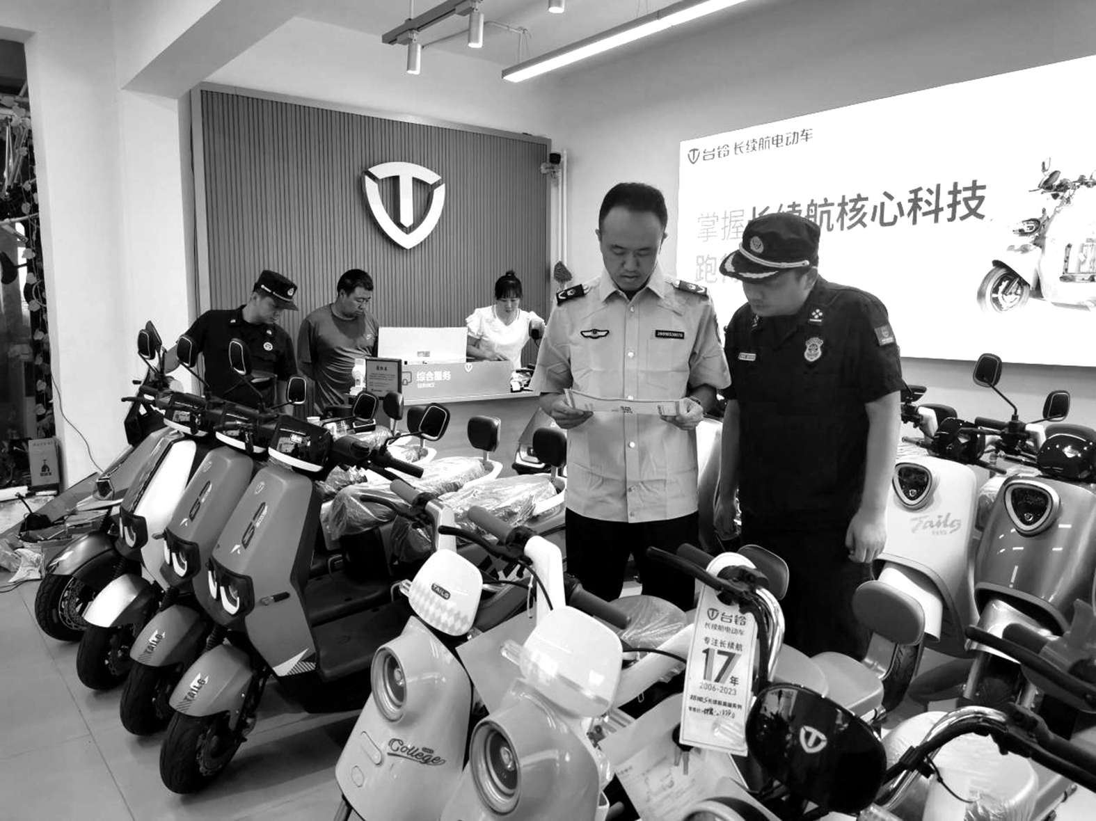 甘肅省華亭市市場(chǎng)監(jiān)管局在電動(dòng)自行車安全隱患全鏈條整治行動(dòng)中提出“查經(jīng)營(yíng)主體,看是否合法;查進(jìn)銷臺(tái)賬,看是否規(guī)范有效;查合格證,看在售商品是否符合ccc認(rèn)證要求”,以進(jìn)一步提高整治成效。圖為執(zhí)法人員日前在一家電動(dòng)自行車專營(yíng)店檢查。 于紅霞 史安良 文/攝