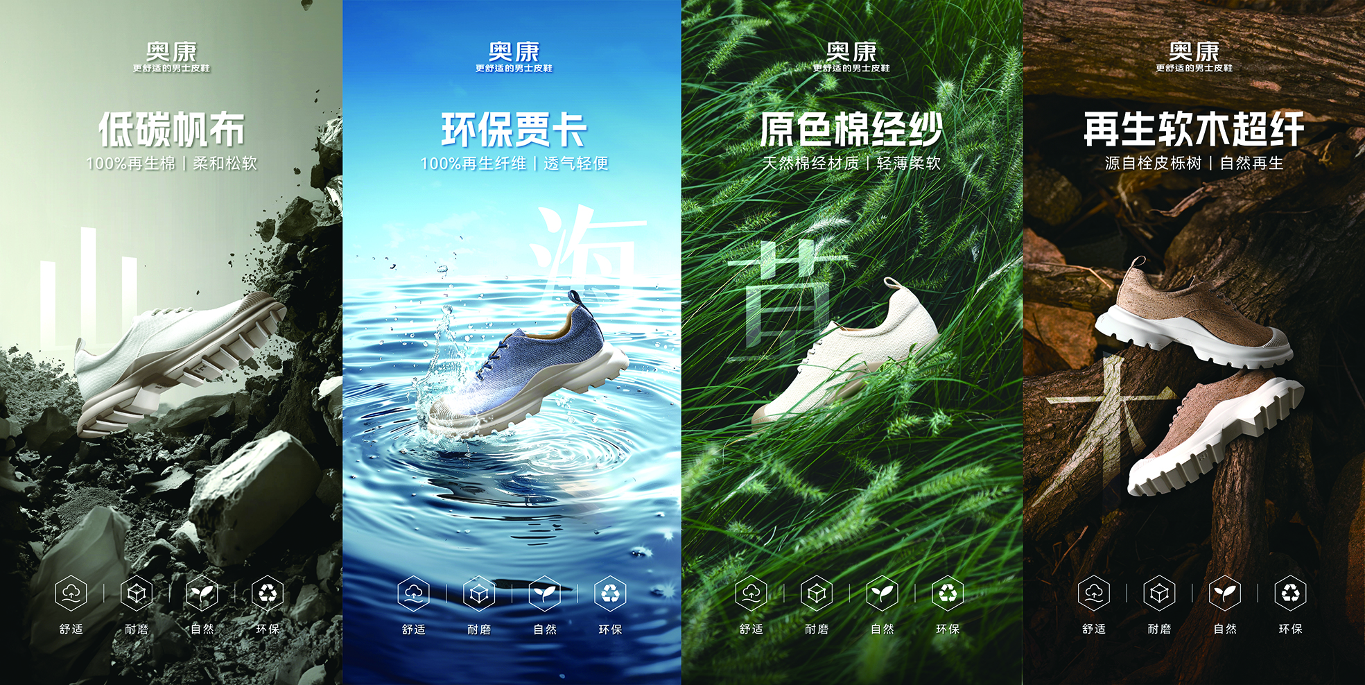 如今,在“舊鞋煥新”行動(dòng)的基礎(chǔ)上,奧康更是融合青年群體的獨(dú)特消費(fèi)需求,將“可持續(xù)性”和“實(shí)用性”融合起來(lái),研發(fā)出了“地球漫步”系列產(chǎn)品。該系列由前BV設(shè)計(jì)師Mirco?Scoccia設(shè)計(jì),秉承“輕近自然,重塑舒適”的理念,從最初的設(shè)計(jì)概念到使用的材料,每一步都致力于增加對(duì)生態(tài)環(huán)境的保護(hù),減少碳足跡。