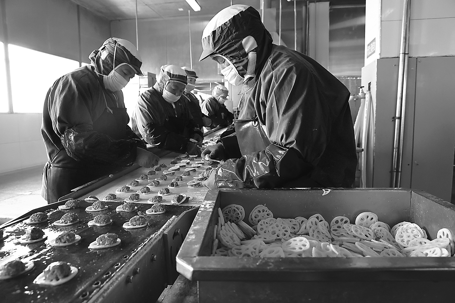 近日,江蘇省揚州市寶應縣藕農(nóng)們采挖、分揀、加工蓮藕,加大產(chǎn)銷力度,保障春節(jié)市場供給。圖為1月12日在當?shù)匾皇称芳庸S,工人們在制作當?shù)靥厣朗场芭簥A子”。