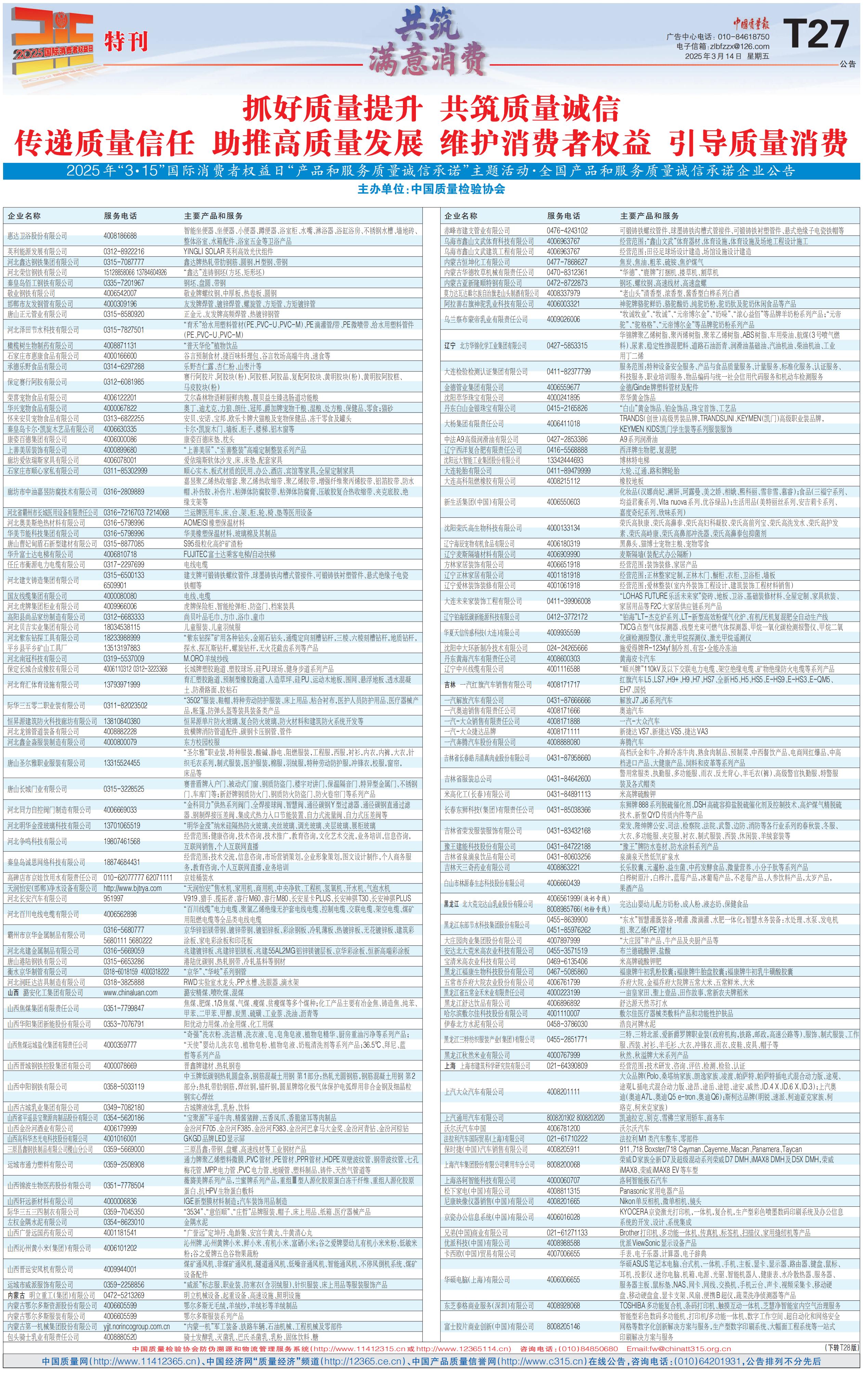 2025年“3·15”國際消費(fèi)者權(quán)益日“產(chǎn)品和服務(wù)質(zhì)量誠信承諾”主題活動·全國產(chǎn)品和服務(wù)質(zhì)量誠信承諾企業(yè)公告(三)
