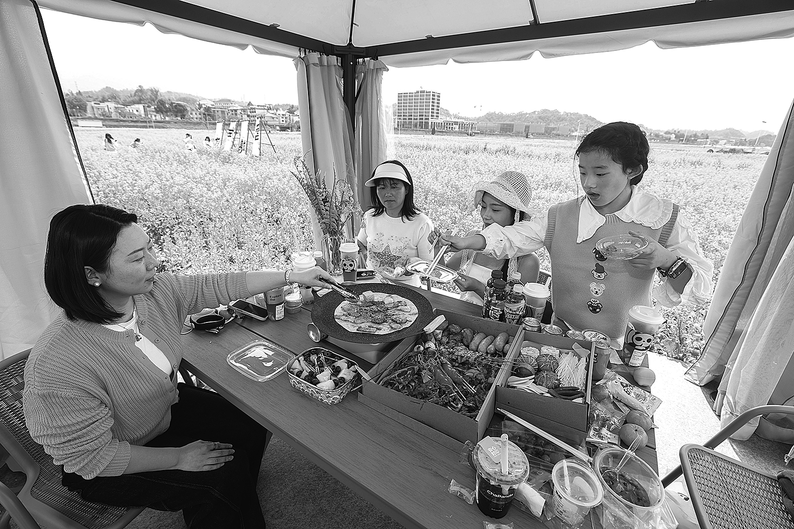 圖為3月23日,游客在油菜花田邊的帳篷里品嘗美食,盡享春光。