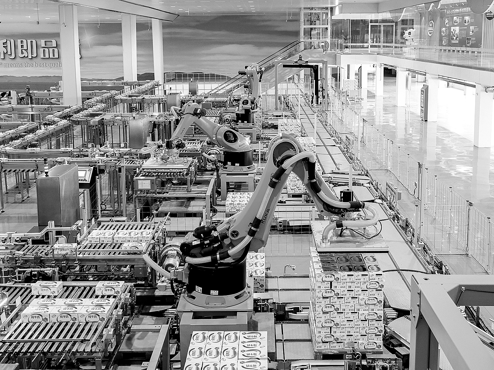 近年來,內(nèi)蒙古自治區(qū)充分發(fā)揮資源稟賦和產(chǎn)業(yè)優(yōu)勢,以科技創(chuàng)新推動乳業(yè)全產(chǎn)業(yè)鏈升級,為保障國家“奶罐子”安全提供科技支撐,助力奶業(yè)高質(zhì)量發(fā)展。圖為4月17日某奶制品智能制造工廠內(nèi),機(jī)械臂正在進(jìn)行包裝作業(yè)。 馬金瑞 攝