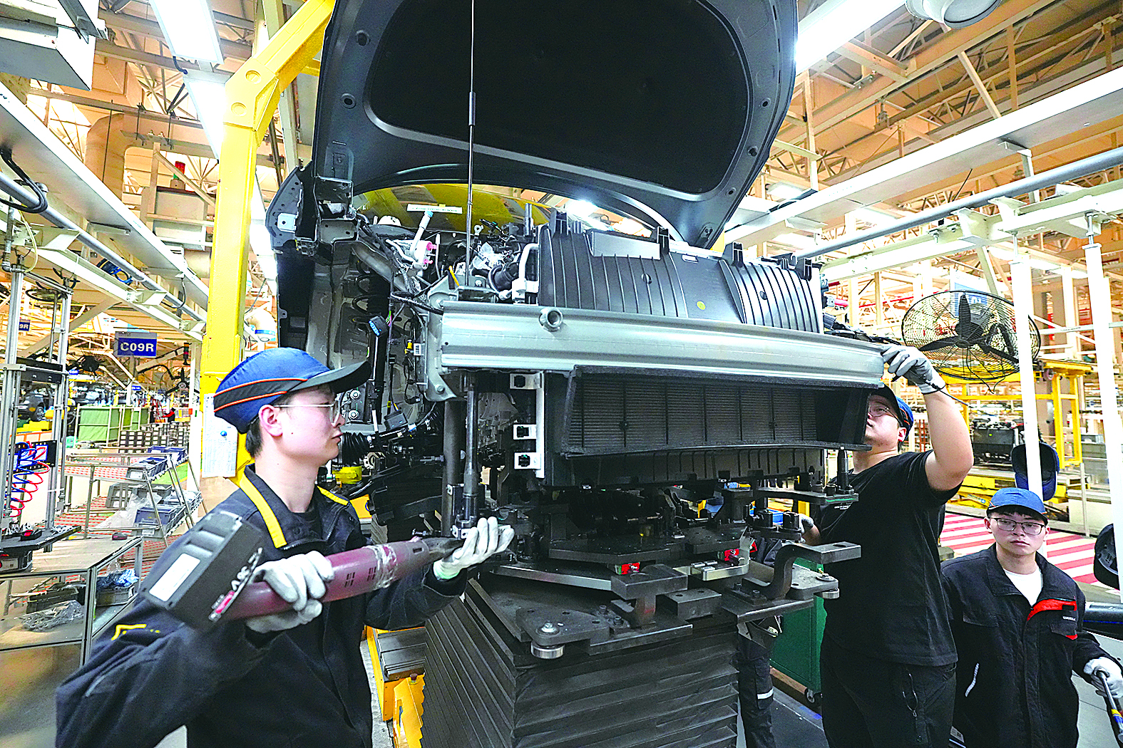 圖為近日,吉利汽車臨海制造基地的工作人員在為新能源車安裝電池包。 翁忻旸 攝
