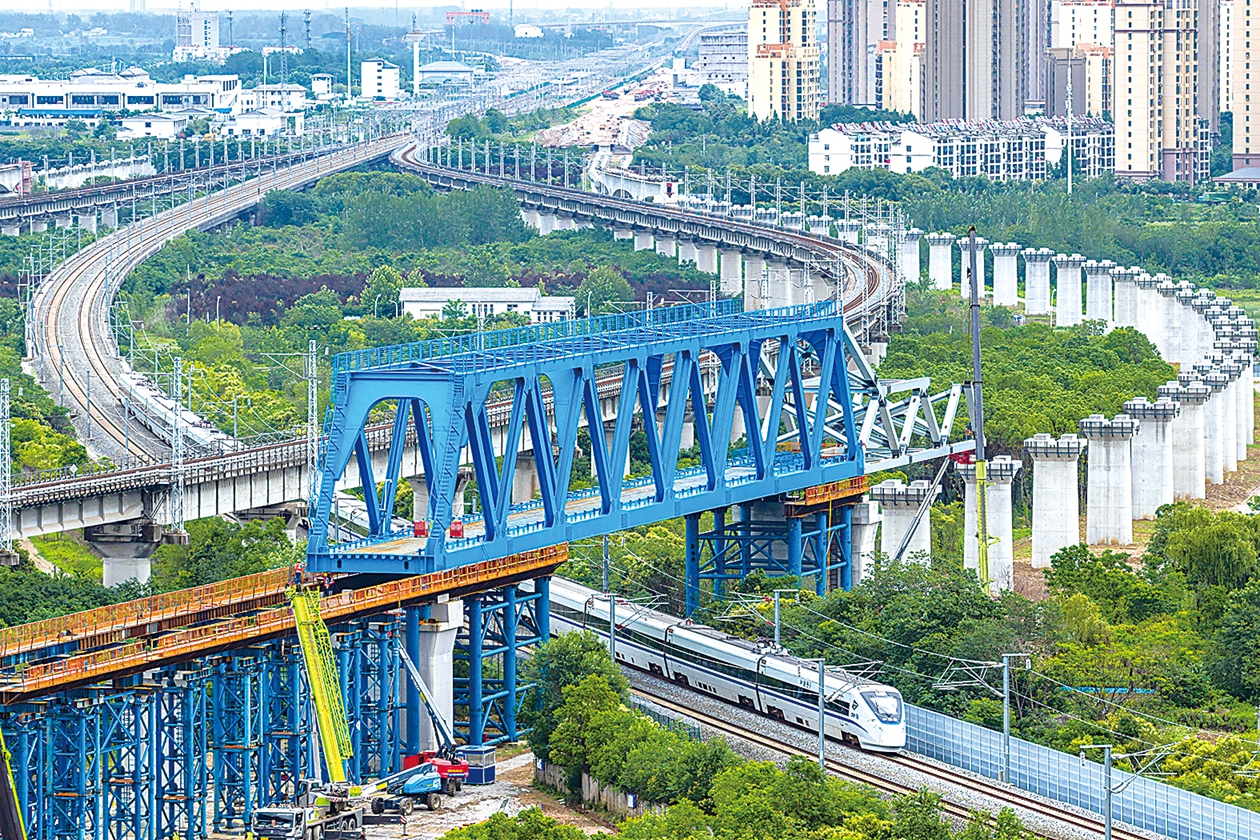 圖為新建滬寧合高鐵鋼桁梁跨越滬蓉鐵路場(chǎng)景。