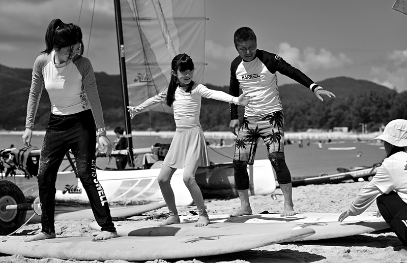 暑期,許多游客來到海南三亞,學習體驗沖浪,感受與海共舞的樂趣。