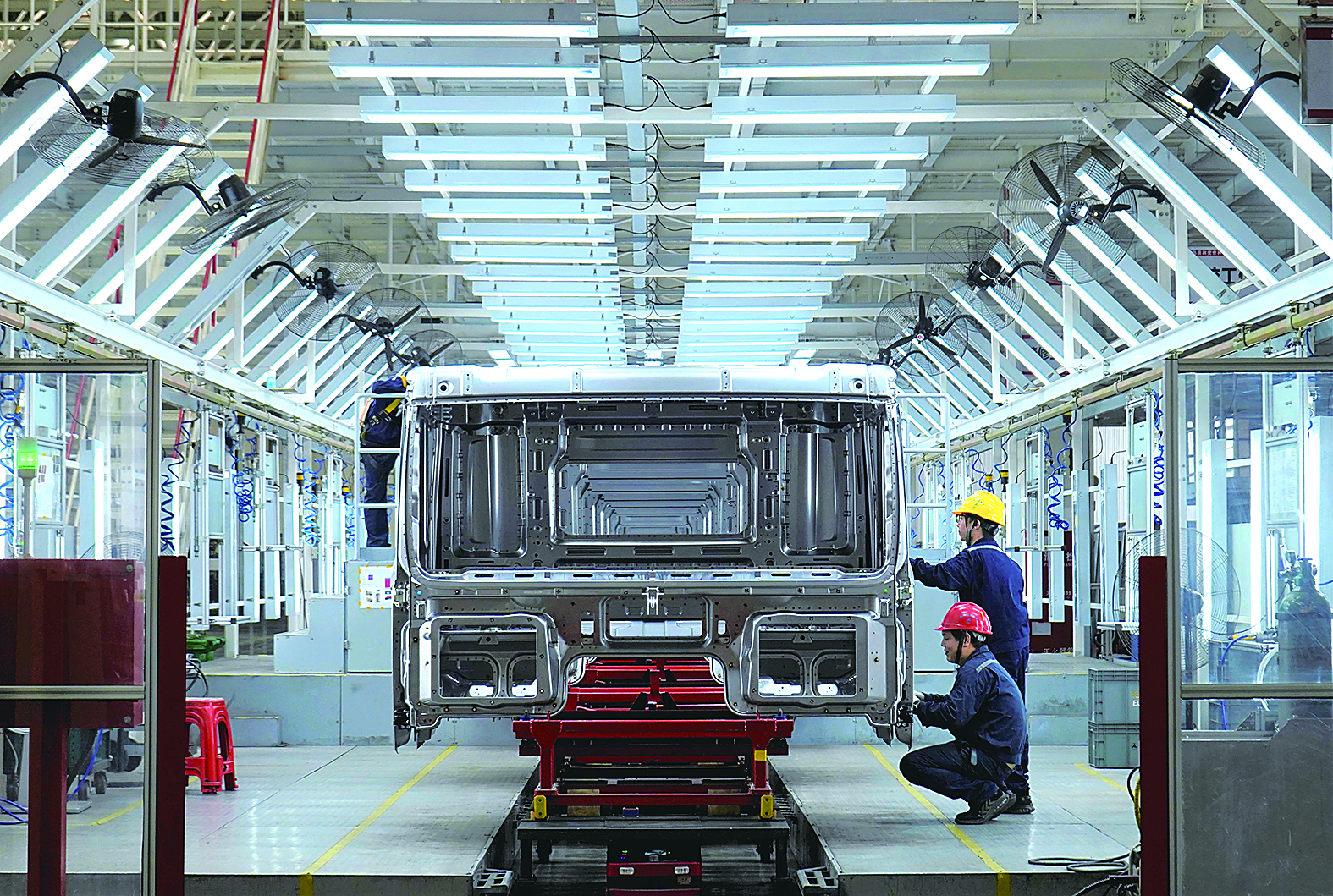圖為湖南省長沙市一家重卡產(chǎn)業(yè)園內(nèi)的生產(chǎn)場景。
