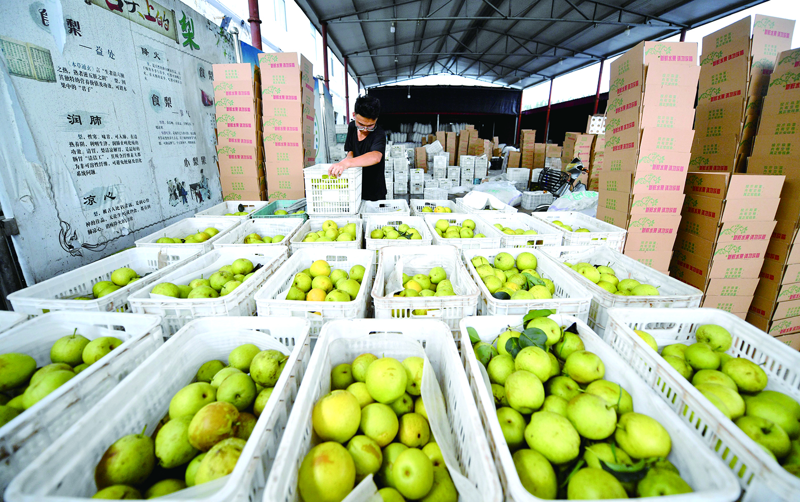 圖為日前工作人員在當(dāng)?shù)匾患依鎴@內(nèi)搬運(yùn)梨果。