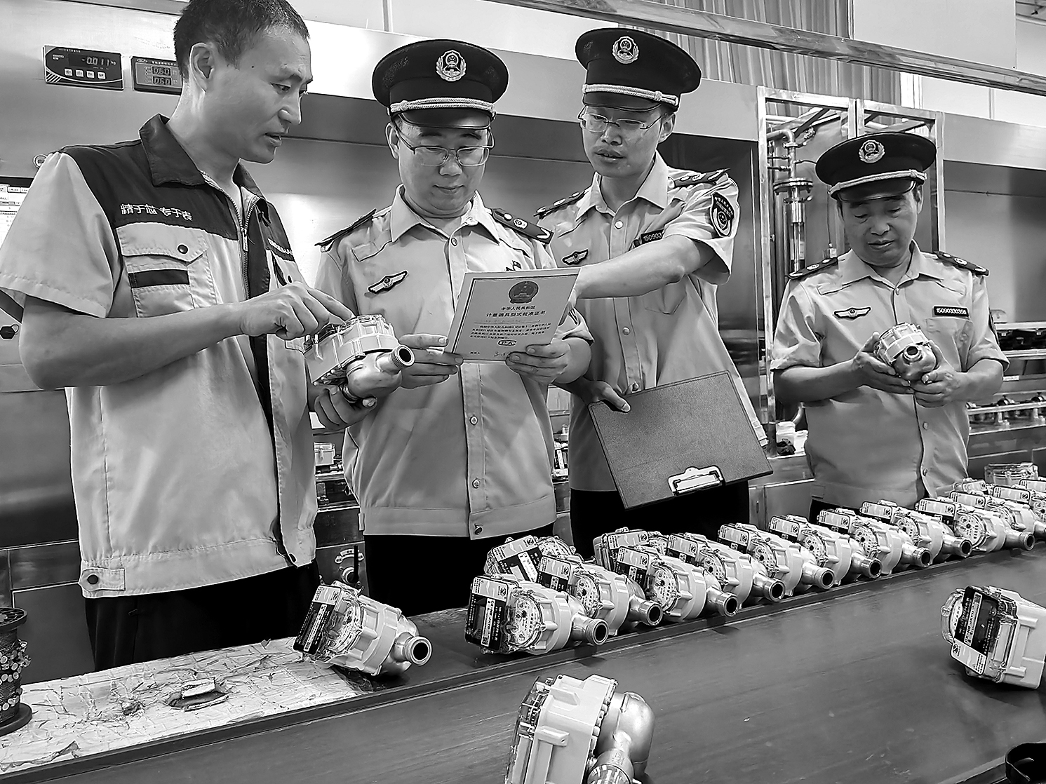 8月28日,山東省寧陽(yáng)縣市場(chǎng)監(jiān)管局對(duì)轄區(qū)水表生產(chǎn)企業(yè)開(kāi)展專項(xiàng)檢查。此次檢查全面排查生產(chǎn)、檢驗(yàn)、銷售環(huán)節(jié),保障水表準(zhǔn)確性與可靠性。圖為該局執(zhí)法人員在某企業(yè)檢查。 何敬華 朱曉光 文/攝