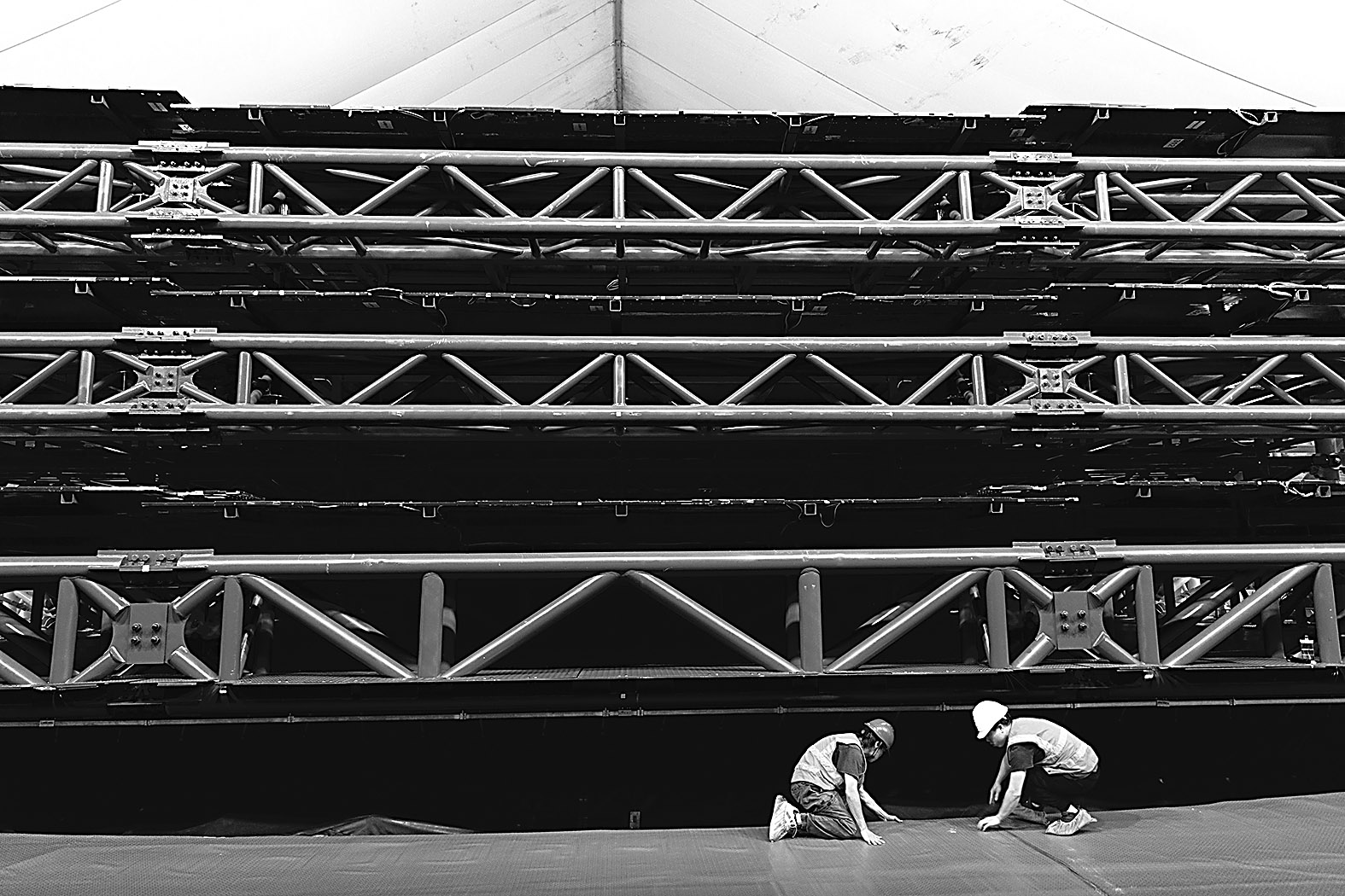 圖為近日工人在江門中微子實驗大廳鋪設(shè)地墊,其頂上三層是繆子探測裝置。