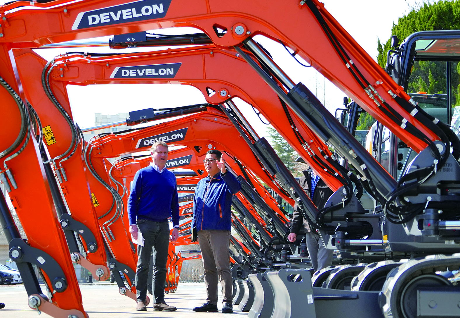 春節(jié)假期過(guò)后,山東省煙臺(tái)市各外貿(mào)企業(yè)積極開(kāi)拓市場(chǎng),吸引訂單,力爭(zhēng)實(shí)現(xiàn)“開(kāi)門(mén)紅”。圖為2月25日在煙臺(tái)黃渤海新區(qū)一家工程機(jī)械生產(chǎn)企業(yè),工作人員正在向外國(guó)客商推介新款挖掘機(jī)。 唐 克 攝