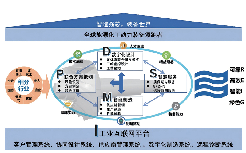 重大技術(shù)裝備研發(fā)、設(shè)計、制造難度大,系統(tǒng)突破和應(yīng)用困難多,任何細微偏差都可能影響國家重大工程安全穩(wěn)定運行,對質(zhì)量的要求極高。沈鼓集團作為高端裝備制造領(lǐng)域的領(lǐng)軍企業(yè),秉承保障國家“五大安全”的初心,踐行“智造強芯,裝備世界”的使命,面向石化、電力、天然氣、煤化工等各細分行業(yè),結(jié)合重大技術(shù)裝備產(chǎn)品特點和應(yīng)用領(lǐng)域特殊性,依據(jù)70余年國產(chǎn)化首臺(套)的經(jīng)驗做法,總結(jié)形成了以突破高端裝備國產(chǎn)化為目標的“智造強芯I—PDMS”質(zhì)量管理模式,依托“高端裝備制造業(yè)工業(yè)互聯(lián)網(wǎng)平臺I”,覆蓋了從“聯(lián)合方案策劃P”“數(shù)字化設(shè)計D”“智能制造M”到“智慧服務(wù)S”的產(chǎn)品全生命周期,為用戶輸出可靠、高效、智能、綠色的核心裝備,實現(xiàn)了從客戶需求到需求實現(xiàn)的端到端的質(zhì)量管理,為解決國家重大技術(shù)裝備首臺(套)突破提供了經(jīng)驗?zāi)J健?/p>