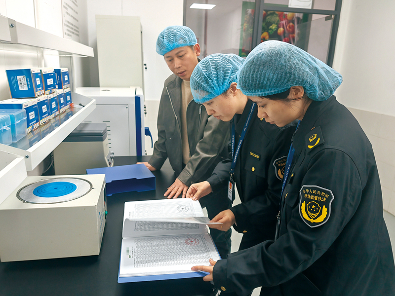 圖為執(zhí)法人員在檢查校園食材供應(yīng)商的快檢記錄。