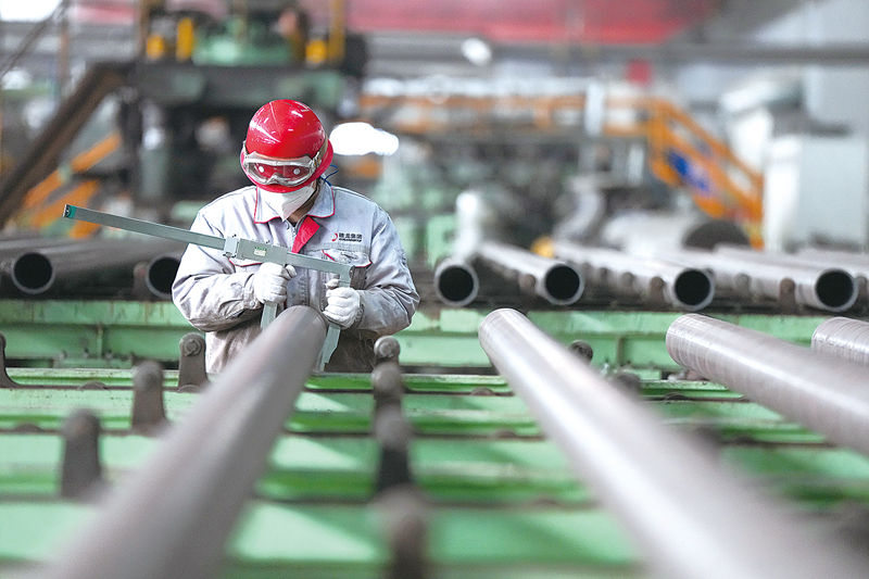 圖為近日黑龍江建龍鋼鐵有限公司軋鋼廠鋼管深加工車間的質(zhì)檢人員正在抽檢無縫鋼管。