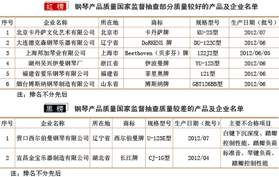國(guó)家質(zhì)檢總局前不久對(duì)鋼琴產(chǎn)品質(zhì)量進(jìn)行了國(guó)家監(jiān)督抽查。本次共抽查了北京、天津、遼寧、上海、江蘇、浙江、福建、山東、廣東、湖北、重慶等11個(gè)省、直轄市40家企業(yè)生產(chǎn)的40種鋼琴產(chǎn)品。