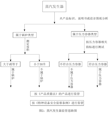 在實(shí)際工作中,蒸汽發(fā)生器存在如何監(jiān)管的問(wèn)題。為了防止和減少事故發(fā)生,保障人民群眾生命、財(cái)產(chǎn)安全,一定要加強(qiáng)對(duì)蒸汽發(fā)生器這類(lèi)型設(shè)備的監(jiān)管力度。因此,筆者建議,對(duì)這類(lèi)型蒸汽發(fā)生器監(jiān)管可以按以下思路(見(jiàn)圖2)進(jìn)行。