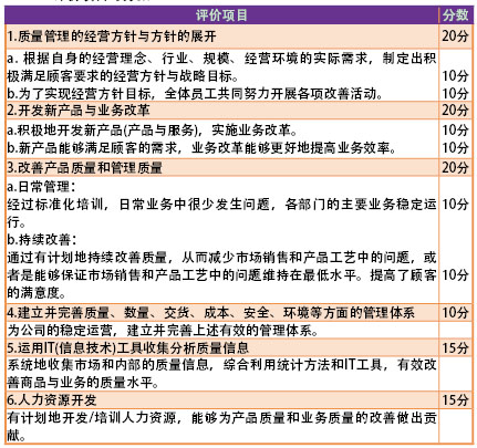 戴明獎(jiǎng)評(píng)審過程中的自我評(píng)價(jià)機(jī)制促進(jìn)了每一個(gè)組織自我成長(zhǎng)的能力,對(duì)此曾經(jīng)有人批評(píng)戴明獎(jiǎng)的評(píng)分標(biāo)準(zhǔn)不夠透明、不夠明確,現(xiàn)在為了提高評(píng)審的透明度,為了能夠更好地反映戴明獎(jiǎng)的評(píng)審目的,評(píng)價(jià)標(biāo)準(zhǔn)已經(jīng)完全公開化。