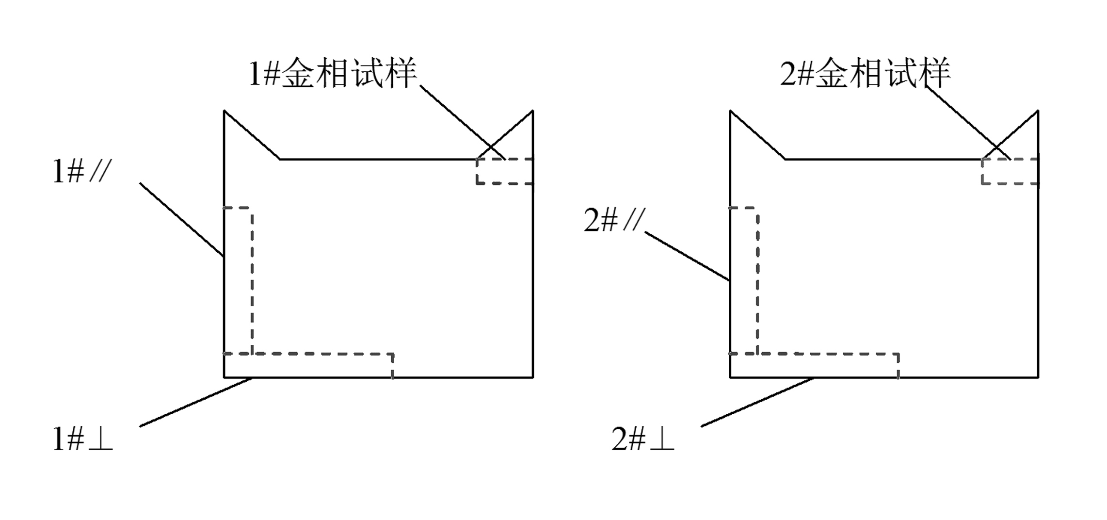 1.1#∥和2#∥試樣是沿平行于配套廠標(biāo)定的鋼板軋制方向取樣,1#⊥和2#⊥是沿垂直于配套廠標(biāo)定的鋼板軋制方向取樣(以“∥”標(biāo)記平行樣,以“⊥”標(biāo)記垂直樣)。