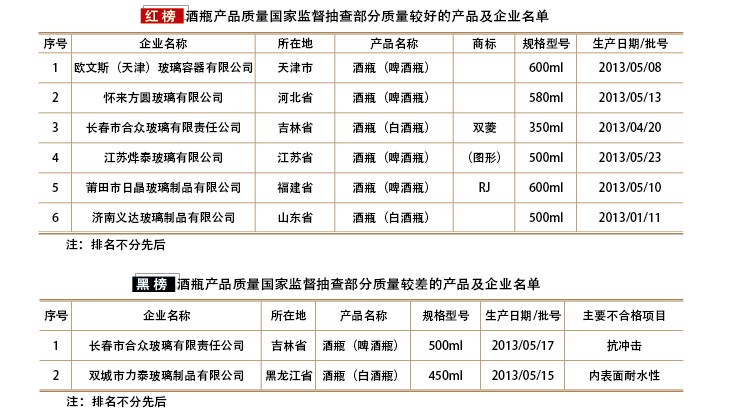 前不久,國(guó)家質(zhì)檢總局對(duì)酒瓶產(chǎn)品質(zhì)量開(kāi)展了國(guó)家監(jiān)督抽查。2013年第三季度,共抽查了天津、河北、遼寧、吉林、黑龍江、上海、江蘇、浙江、安徽、福建、山東、河南、湖北、湖南、廣東、廣西、四川、貴州、云南、陜西、甘肅、新疆等22個(gè)省、自治區(qū)、直轄市106家企業(yè)生產(chǎn)的120批次酒瓶產(chǎn)品。