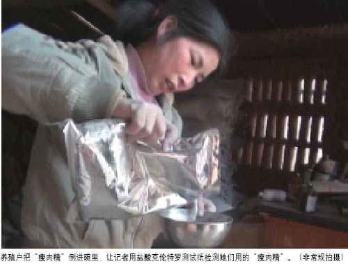 這位養(yǎng)豬戶告訴記者,這就是“瘦肉精”。他說,這種瘦肉精大多都是由收購生豬的商販或者當(dāng)?shù)卣{(diào)運生豬的經(jīng)紀(jì)人提供,每公斤賣到二三百元,養(yǎng)豬戶買來以后,按比例添加到飼料里面。“我1000斤(飼料)加120克(瘦肉精)。”他說,“從一百八九十斤喂豬到二百二三十斤重,喂一個月?!睂嶋H上,各養(yǎng)殖戶加瘦肉精的量并不一致,另外一位養(yǎng)殖戶就告訴記者,“1000斤加4兩”。