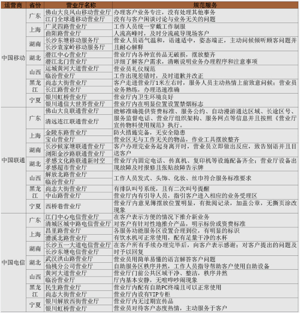 《中國質(zhì)量萬里行》明察暗訪組一行選擇了代表區(qū)域特點(diǎn)的省份,沿海地區(qū)選擇廣東省、上海市,華中地區(qū)選擇湖南湖北兩省,華北地區(qū)山西省,東北地區(qū)黑龍江省,西北地區(qū)寧夏回族自治區(qū)。調(diào)查內(nèi)容主要分為:1.內(nèi)外環(huán)境綜合評價(jià)2.設(shè)備完善率3.主動(dòng)服務(wù)達(dá)標(biāo)度4.新業(yè)務(wù)推廣及實(shí)物銷售5.應(yīng)急事件處理6.語音服務(wù)??傮w來看大多數(shù)營業(yè)廳服務(wù)規(guī)范。