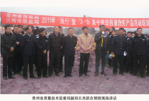 2011年3月11日,貴州省質(zhì)量技術(shù)監(jiān)督局、貴陽市質(zhì)量技術(shù)監(jiān)督局在烏當(dāng)區(qū)東風(fēng)鎮(zhèn)高雁垃圾處置中心對省、市質(zhì)監(jiān)查獲的部分假冒偽劣食品、白酒、絮用纖維制品等價值200萬元的假冒偽劣產(chǎn)品進(jìn)行集中銷毀,表明了貴州質(zhì)監(jiān)部門打假治劣、整頓和規(guī)范市場經(jīng)濟(jì)秩序的強(qiáng)有力的工作力度,也顯示了對制假售假違法活動犯罪分子的強(qiáng)大的震懾力量。