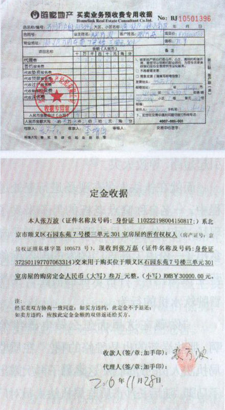 經(jīng)過(guò)幾個(gè)月的比較和考慮,最后通過(guò)鏈家地產(chǎn)中介介紹,看中了北京市順義區(qū)石園東苑7號(hào)樓3單元301房子,房主也姓張,跟張萬(wàn)磊的名字只有一字之差,叫張萬(wàn)波。當(dāng)時(shí)張先生詢問(wèn)了鏈家辦理此項(xiàng)業(yè)務(wù)的置業(yè)顧問(wèn),問(wèn)房產(chǎn)證的真假,置業(yè)顧問(wèn)回答說(shuō)沒(méi)有問(wèn)題,這個(gè)房子已經(jīng)通過(guò)網(wǎng)簽,可以核實(shí)該房產(chǎn)的產(chǎn)權(quán)。于是在2010年11月27日他就通過(guò)鏈家地產(chǎn)中介簽定了協(xié)議,交了3萬(wàn)元定金給房主,另外還交了中介費(fèi)3.39萬(wàn)(含其它雜項(xiàng))給鏈家地產(chǎn)。
