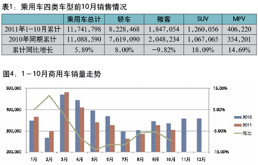 根據(jù)中汽協(xié)最新數(shù)據(jù),2011年10月份汽車銷售152.5萬輛,環(huán)比下降7.4%,同比下降1.1%;1-10月,汽車銷量1516.1萬輛,同比增長3.2%。年初,中汽協(xié)預(yù)計車市增速10%-15%,全年銷量目標(biāo)2000萬輛。7月,中汽協(xié)認(rèn)為國內(nèi)汽車市場下半年面臨著較大的不確定性,預(yù)計全年汽車產(chǎn)銷增幅約為5%。11月,中汽協(xié)表示,今年車市產(chǎn)銷增幅將降至3%,也不排除全年產(chǎn)銷出現(xiàn)“零”增長的局面。
