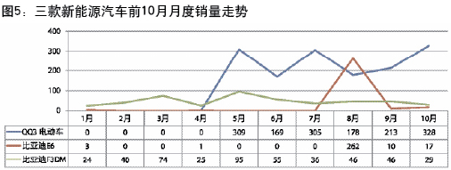 另外,在中汽協(xié)提供的所有車型的銷量中,已統(tǒng)計銷量數(shù)據(jù)的新能源車型只有三款,分別是奇瑞的QQ3電動車、比亞迪E6、比亞迪F3DM。1-10月份,三款車的累計銷量為2265輛。具體月度銷量如圖5所示: