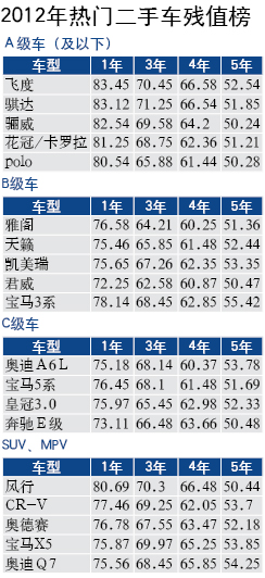 某專業(yè)機(jī)構(gòu)統(tǒng)計(jì)的2010年二手車殘值率表顯示:相對(duì)于價(jià)格較高的商務(wù)車和豪華車,家庭用車A級(jí)車的殘值率最高。像飛度,卡羅拉,驪威,Polo等市場(chǎng)占有率大的熱門代表車型第一年的殘值率都在80%以上。而B、C級(jí)車以及大型的SUV和MPV車型中第一年的殘值率幾乎沒有能達(dá)到80%。其中第一年殘值率最高的是飛度,最低的則為君威。而從第三年開始到第四年,殘值率領(lǐng)先的依然是A級(jí)車。但從第四年開始,中高端車型的優(yōu)勢(shì)開始顯現(xiàn),用料和內(nèi)飾方面的優(yōu)勢(shì)以及較高的技術(shù)含量和車身保護(hù)措施使其耐久性較好的特點(diǎn)得以顯現(xiàn)。