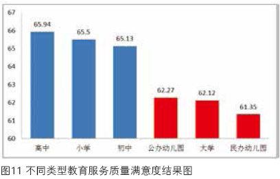如圖11所示,總體而言義務教育的滿意度要高于非義務教育,非義務教育尤其是大學和幼兒園都是人們最不滿意的類別,其得分在61-62.5分之間,與滿意度較高的初中、小學相比分值相差3-4分。這提醒我們,隨著義務教育的不斷普及,要進一步提升人們對于教育服務的滿意度,應主要加大對于非義務教育,特別是學前教育的投入,尤其是對民辦學前教育的管理和投入。