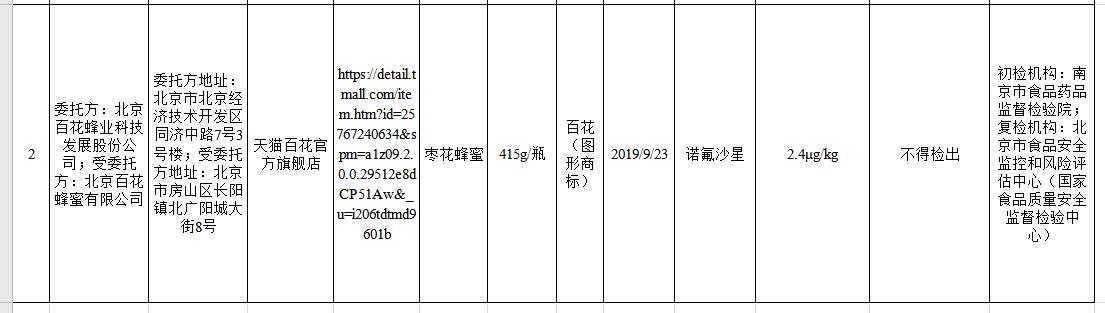 通告顯示,此次抽檢中,在天貓(網(wǎng)店)銷售的、標(biāo)稱北京百花蜂業(yè)科技發(fā)展股份公司委托北京百花蜂蜜有限公司生產(chǎn)的棗花蜂蜜(415g/瓶,2019/9/23),諾氟沙星檢出值為2.4μg/kg,而食品安全國(guó)家標(biāo)準(zhǔn)規(guī)定不得檢出。
