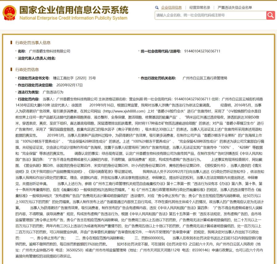 國家企業(yè)信用信息公示系統(tǒng)顯示,廣州香爵生物科技有限公司還有一起公開行政處罰,處罰決定日期為2020年2月17日,該公司因發(fā)布違法廣告被原廣州市白云區(qū)工商行政管理局處罰,罰款60萬元。