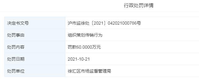 據(jù)悉,該處罰決定文書為滬市監(jiān)徐處〔2021〕042021000786號,處罰日期為2021年10月21日。