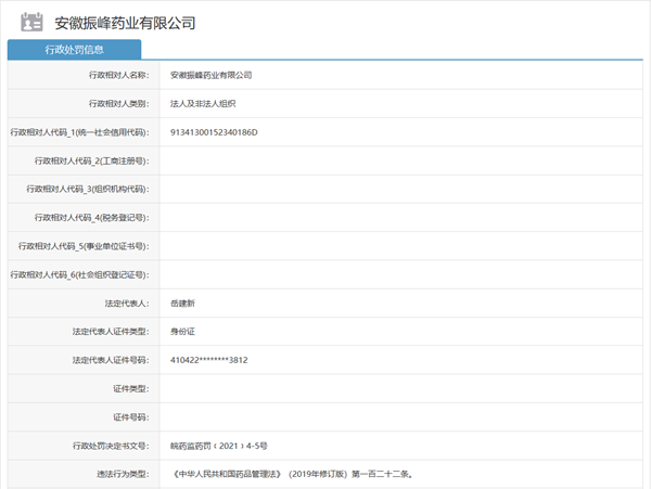 中國(guó)網(wǎng)財(cái)經(jīng)12月6日訊(記者杜丁 見習(xí)記者安荻)日前,安徽省藥品監(jiān)督管理局發(fā)布一則關(guān)于安徽振峰藥業(yè)有限公司的行政處罰信息(皖藥監(jiān)藥罰﹝2021﹞4-5號(hào))。