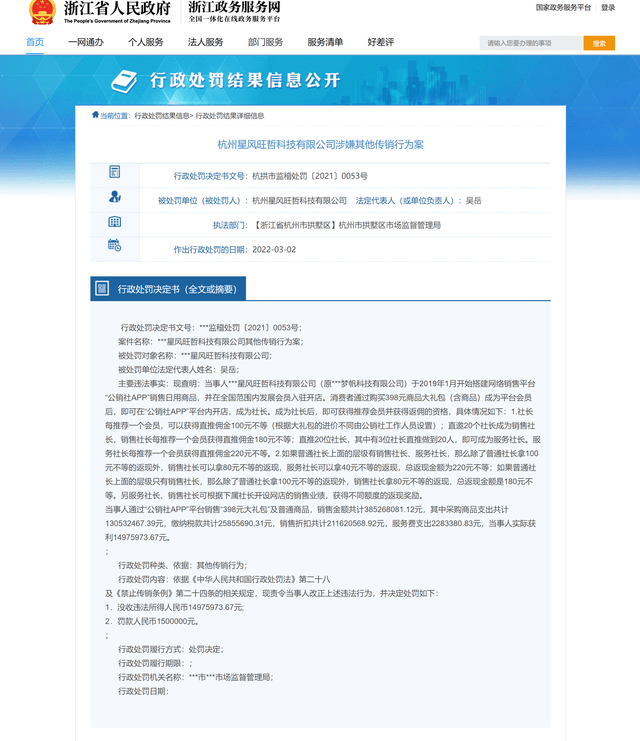 日前,北青網(wǎng)健康在浙江政務(wù)服務(wù)網(wǎng)上看到一則行政處罰信息,顯示為杭州星風(fēng)旺哲科技有限公司因涉嫌傳銷,被杭州市拱墅區(qū)市場(chǎng)監(jiān)督管理局共計(jì)罰沒資金16475973.67元。