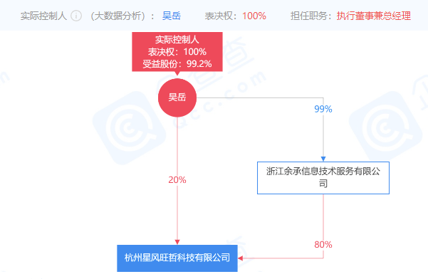 企查查顯示,杭州星風(fēng)旺哲科技有限公司成立于2019年1月7日,(曾用名:北京夢(mèng)帆科技有限公司)注冊(cè)資金1億元,法人代表為吳岳,也是公司的實(shí)際控制人,直接持股20%,通過浙江余承信息技術(shù)服務(wù)有限公司簡(jiǎn)介間接持股后,最終受益股份達(dá)到了99.2%。