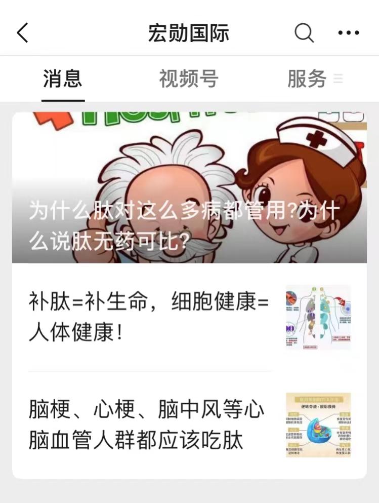 中國(guó)質(zhì)量新聞網(wǎng)調(diào)查發(fā)現(xiàn),經(jīng)此番處罰之后,“宏勛國(guó)際”微信公眾號(hào)上依舊存在《肽不是藥,卻比藥更珍貴,相信肽受益一生!》《為什么肽對(duì)這么多疾病都管用?為什么說(shuō)肽無(wú)藥可比?》《腦梗、心梗、腦中風(fēng)等心腦血管人群都應(yīng)該吃肽》《腫瘤愛(ài)憎人群在放化療時(shí)吃肽可減輕病痛、延長(zhǎng)壽命》等等介紹肽與疾病治療的多篇文章。
