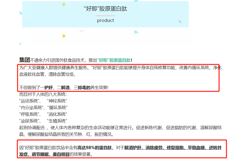 此外,在產(chǎn)品介紹中還宣稱,“好即”膠原蛋白肽能夠提升身體自我修復(fù)功能,改善內(nèi)循環(huán)系統(tǒng),凈化血液軟化血管,清除血管垃圾。能促進(jìn)新陳代謝,促進(jìn)脂肪的代謝,溶解尿酸結(jié)晶,緩解尿酸鹽結(jié)晶所致的關(guān)節(jié)腫、紅、脹的情況。還因“好即”膠原蛋白肽飲品中含有高達(dá)98%的蛋白肽,對(duì)于解酒護(hù)肝,消除疲勞、修復(fù)細(xì)胞,平穩(wěn)血糖,逆轉(zhuǎn)并發(fā)癥,調(diào)節(jié)睡眠,美白明目的效果顯著。
