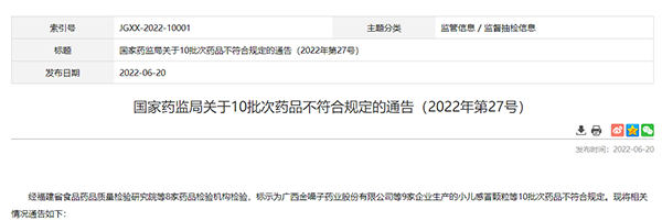 中國網(wǎng)財經(jīng)6月21日訊(記者 杜丁)昨日,國家藥監(jiān)局發(fā)布“關(guān)于10批次藥品不符合規(guī)定的通告”,經(jīng)福建省食品藥品質(zhì)量檢驗研究院等8家藥品檢驗機構(gòu)檢驗,標示為廣西金嗓子藥業(yè)股份有限公司等9家企業(yè)生產(chǎn)的小兒感冒顆粒等10批次藥品不符合規(guī)定。