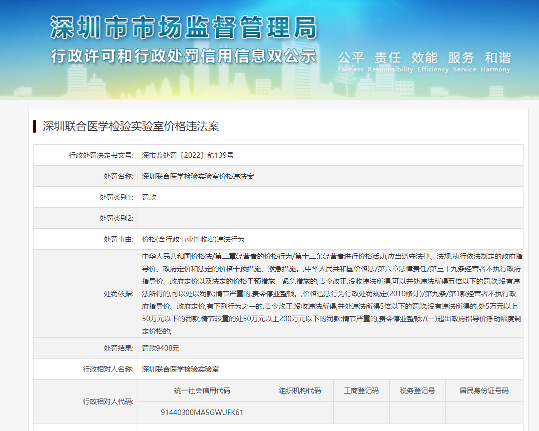 中國網(wǎng)財(cái)經(jīng)7月14日 (記者 鐘文鑫)據(jù)深圳市場監(jiān)督管理局消息,近日,深圳聯(lián)合醫(yī)學(xué)檢驗(yàn)實(shí)驗(yàn)室因價(jià)格違法行為,被深圳市市場監(jiān)督管理局罰款9408元。
