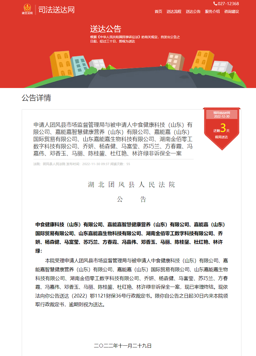 據(jù)該公告內(nèi)容顯示,團(tuán)風(fēng)縣人民法院受理申請(qǐng)人團(tuán)風(fēng)縣市場(chǎng)監(jiān)督管理局與被申請(qǐng)人中食健康科技(山東)有限公司、嘉能嘉智慧健康營(yíng)養(yǎng)(山東)有限公司、嘉能嘉(山東)國(guó)際貿(mào)易有限公司、山東嘉能嘉生物科技有限公司、湖南金佰零工數(shù)字科技有限公司、喬妍、楊森健、馬富瑩、蘇巧蘭、方春霞、馮嘉偉、鄧香玉、馬麗、陳桂鋆、杜紅艷、林許綠非訴保全一案,現(xiàn)已審理終結(jié),現(xiàn)依法向上述公司及人員公告送達(dá)(2022)鄂1121財(cái)保36號(hào)行政裁定書。限上述企業(yè)及人員自公告之日起30日內(nèi)到團(tuán)風(fēng)縣人民法院領(lǐng)取行政裁定書,逾期則視為送達(dá)。該公告發(fā)布日期為2022年11月29日,視同送達(dá)的最終日期為2022年12月30日,目前還有3天。