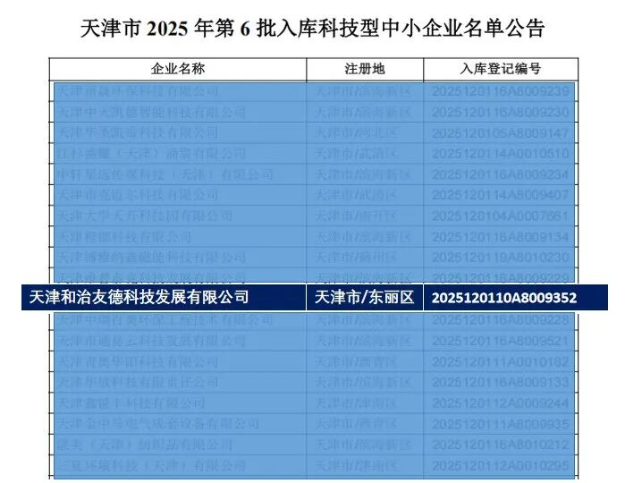 10月29日,天津市科學(xué)技術(shù)局網(wǎng)站對天津市2025年第六批入庫科技型中小企業(yè)名單予以公告,天津和治友德科技發(fā)展有限公司榜上有名。