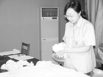 新學(xué)年將至,江蘇省泰州市質(zhì)量技術(shù)監(jiān)督局將服務(wù)和產(chǎn)品質(zhì)量監(jiān)督送入校門,免費(fèi)為入學(xué)新生嚴(yán)把用具質(zhì)量關(guān)。圖為泰州市纖維產(chǎn)品質(zhì)量監(jiān)督檢驗(yàn)所檢驗(yàn)人員正在嚴(yán)格依據(jù)標(biāo)準(zhǔn)檢驗(yàn)學(xué)生用棉絮的感官質(zhì)量。
